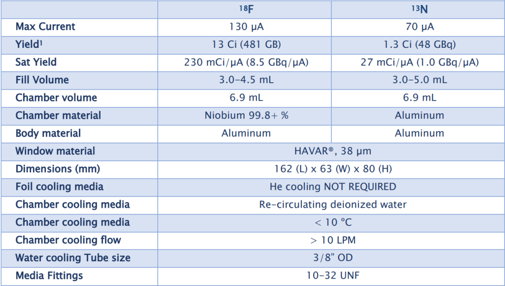 This target is fully compatible with the GE PETtrace cyclotron target ports. It does not require Helium cooling. Ask for energy degraders for production of radiometals.