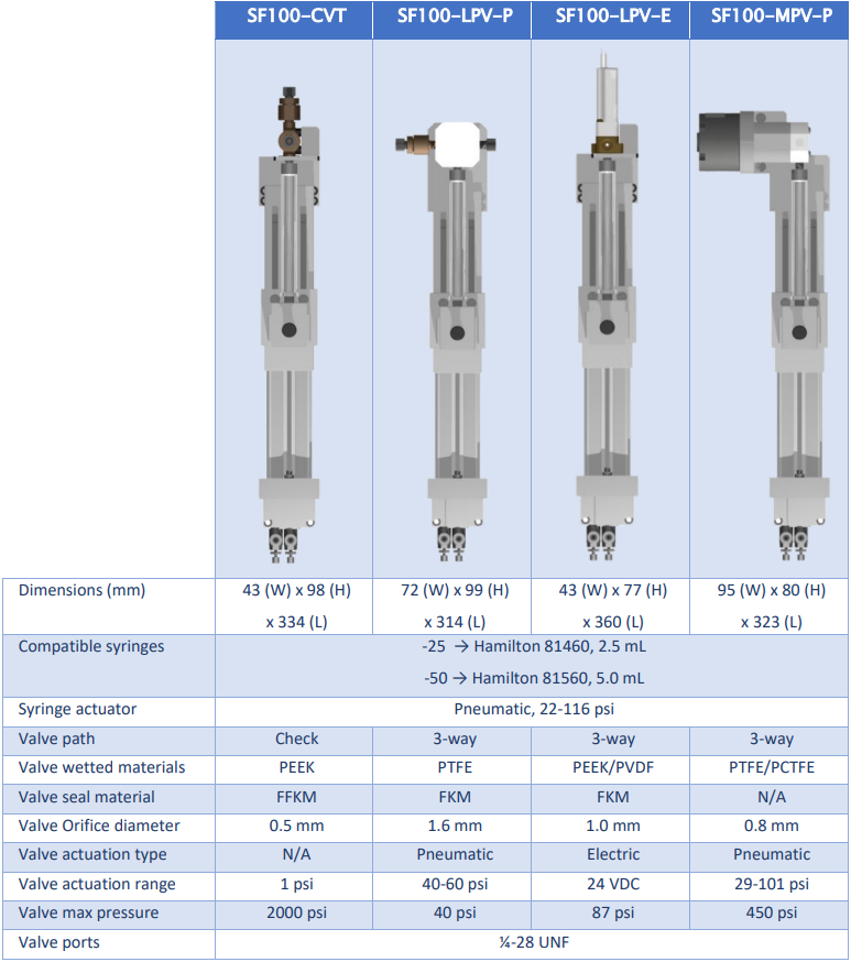 Pneumatic syringe pump with low pressure solenoid valve for fill/empty operation control.